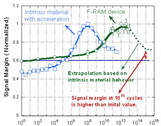 當前對0.13μm FRAM的1015個周期的耐用性規范基于對使用0.13μm技術節點構建的并行FRAM核心存儲器產品的樣本中1,280位FRAM存儲器的初步評估。圖1顯示FRAM設備級信號容限在1012和1013個周期之間達到最大值。根據本征材料對0.13μm