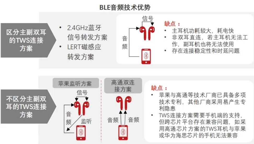 藍牙芯片的重要應用場景。早期藍牙標準不支持無線多路直連,無法實現雙耳同步傳輸,普通藍牙耳機僅能實現一對一連接,蘋果采用Snoop監聽模式,在一只耳機進行藍牙音頻傳輸時,另一只耳機利用它們之間的私有協議對其進行監聽,達到1對2連接的目的。由于蘋果對監聽模式進行專利封鎖,早期安卓TWS廠商主要采用relay轉發模式,將音頻從手機傳至左耳設備,再由左耳轉發至右耳,但該方案存在諸多劣勢,例如(1)音頻傳輸過程較長造成連接不穩定;(2)延遲問題嚴重;(3)接受音頻傳輸的主用耳機的電池功耗顯著高于輔用耳機。安卓TWS廠商受限于技術實力,TWS耳機產品音頻傳輸體驗亟待提升。
