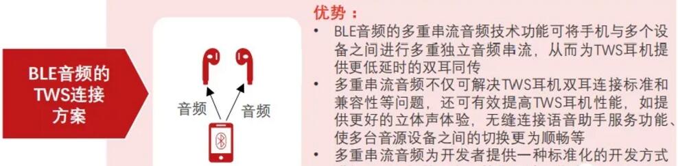 藍牙技術聯盟推出BLEA標準,BLEA標準的頒布打破蘋果TWS專利封鎖,解決TWS耳機雙耳直連的標準和兼容性問題,將釋放安卓TWS廠商生產力。