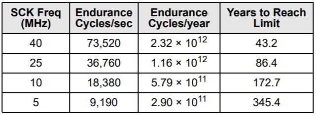 FeRAM存儲(chǔ)器具有讀取和還原機(jī)制。因此,對(duì)于存儲(chǔ)陣列的每次訪問(wèn)(讀取或?qū)懭耄瑢葱惺┘幽途弥芷凇?FRAM體系結(jié)構(gòu)基于每個(gè)64位的16K行的行和列的陣列。整個(gè)行在內(nèi)部訪問(wèn)一次,無(wú)論是讀取還是寫入一個(gè)字節(jié)或全部八個(gè)字節(jié)。在耐久性計(jì)算中,該行中的每個(gè)字節(jié)僅被計(jì)數(shù)一次。下圖顯示了一個(gè)64字節(jié)重復(fù)循環(huán)的耐久性計(jì)算,該循環(huán)包括一個(gè)操作碼,一個(gè)起始地址和一個(gè)順序的64字節(jié)數(shù)據(jù)流。這將導(dǎo)致每個(gè)字節(jié)在整個(gè)循環(huán)中經(jīng)歷一個(gè)持久周期。即使在40 MHz時(shí)鐘速率下,F(xiàn)RAM的讀寫持久性實(shí)際上也是無(wú)限的。