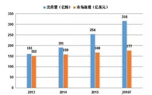 IC Insights研究報告顯示,2015年全球MCU市場規模達到168億美元,較去年增長5.6%,出貨量255億顆比去年提升12.4%,預計2016年全球MCU市場出貨量將突破300億顆大關。其中,2015年全球32位MCU出貨量超過4/8位MCU與16位MCU出貨量的總和,而且未來幾年應該會保持30%左右的高速增長的水平。