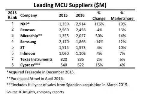 隨著物聯(lián)網(wǎng)領(lǐng)域應(yīng)用對(duì)MCU需求的進(jìn)一步增長(zhǎng)。為了搶占市場(chǎng)份額,供應(yīng)商們進(jìn)行了多次的并購(gòu),并最終改變了MCU的供應(yīng)商排名。根據(jù)IC Insights的統(tǒng)計(jì),全球最大的MCU供應(yīng)商由收購(gòu)了Freescale的NXP擔(dān)當(dāng),而Microchip、Cypress也通過收購(gòu),提高營(yíng)收,擴(kuò)大了在MCU市場(chǎng)的份額。但因?yàn)樵?016年,MCU的增長(zhǎng)并沒有那么明顯,那就沒有更多的收購(gòu)事件發(fā)生。