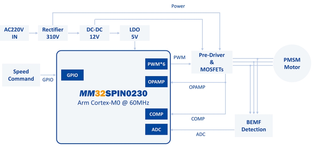 MM32SPIN0230,它采用Arm® Cortex-M0內(nèi)核,最高工作頻率可達(dá)60MHz,內(nèi)置32KB Flash和4KB SRAM,具備1路12位模數(shù)轉(zhuǎn)換器ADC,支持11通道,采樣速率達(dá)1Msps,以及4個(gè)通用定時(shí)器和1個(gè)專(zhuān)為電機(jī)控制設(shè)計(jì)的PWM高級(jí)定時(shí)器。此外,它還支持UART/SPI通信,并內(nèi)置2個(gè)運(yùn)放、2個(gè)比較器,專(zhuān)為電機(jī)應(yīng)用而設(shè)計(jì)。