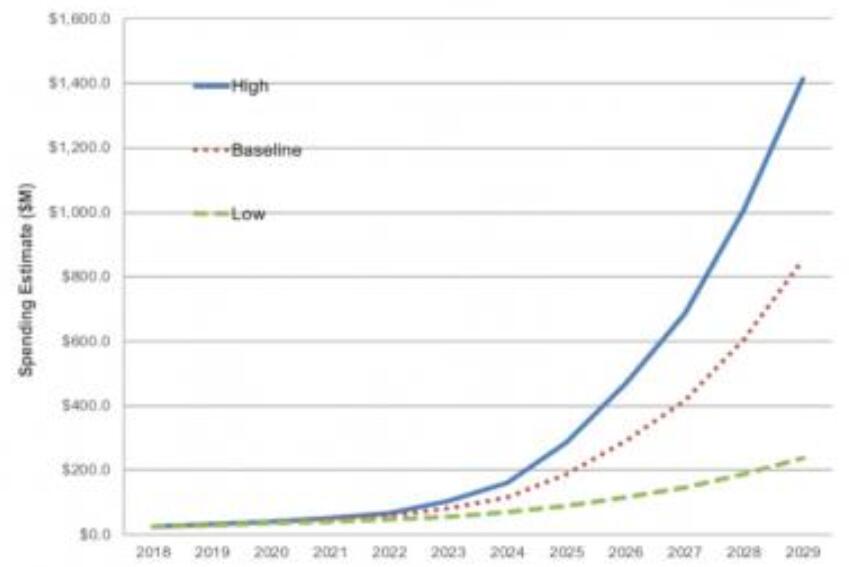 對MRAM存儲器的巨大需求將刺激設備支出的穩步增長。預計MRAM設備市場將從2018年的2600萬美元增長到2029年的854美元-增長33倍。