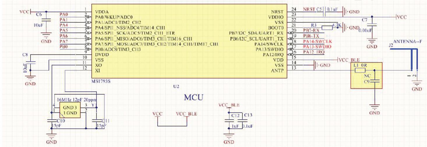 藍(lán)牙芯片,射頻采用2.4GHz ISM 頻段的頻率,2MHz 信道間隔,符合藍(lán)牙規(guī)范。MS1793S使用高性能的ARM®Cortex®-M0 為內(nèi)核的32 位MCU,它的工作頻率最高可達(dá)48MHz,內(nèi)置高速存儲(chǔ)器,豐富的增強(qiáng)型I/O 端口和外設(shè)連接到AHB 和APB 總線。MS1793S工作電壓為2.0V ~ 3.6V,工作溫度范圍包含-40℃~ +85℃常規(guī)型。多種省電工作模式適合低功耗應(yīng)用的要求。