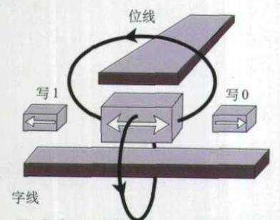 MRAM單元自由層產(chǎn)生的合成磁場來實(shí)現(xiàn)。在運(yùn)行時(shí),利用編碼排序使二維MRAM陣列中只有一條字線和一條位線通過電流(如圖1),因而只有一個(gè)MRAM單元被選中,這時(shí)可以有兩種寫人狀態(tài):