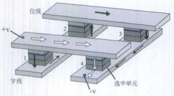 圖4給出由4個(gè)MRAM單元組成的刪格,在一條位線和一條字線加上電壓后,由圖可見被選中的是4號(hào)MRAM單元,這時(shí)電流從‘+V’電極流至‘-V’電極可以有兩條通道。