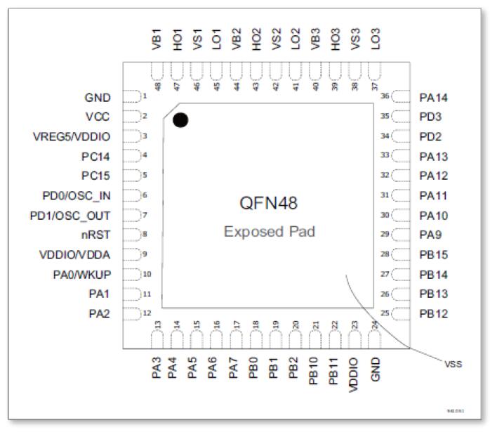 國產32位單片機MM32SPIN360C擁有M0內核的高性能32位微控制器,5V輸出的LDO穩壓器、三組具備有自舉二極管的N通道半橋柵極驅動器。MCU最高工作頻率可達96MHz,并內置SRAM高速存儲器,增強豐富型I/O端口和外設連接到外部總線。采用QFN48封裝形式。本產品包含2個12位的ADC、3個比較器、3個運算放大器、1個16位通用定時器、1個32位通用定時器、3個16位基本定時器、2個16位高級定時器。還包含標準的通信接口:1個I2C接口、1個SPI接口和2個UART接口。