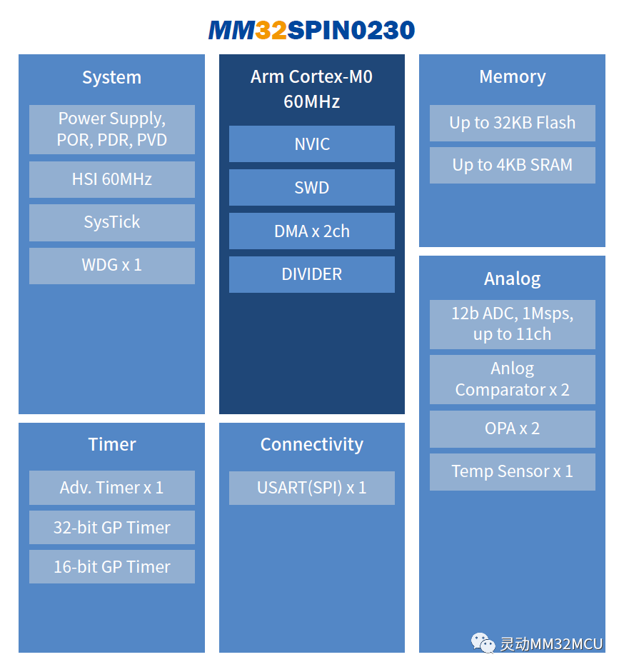 MM32SPIN0230內部集成了具有靈動特色的電機控制功能:高階4路互補PWM、注入功能的高精度ADC、軌到軌運放、輪詢比較器、32位針對霍爾傳感器的捕獲時鐘、以及硬件除法器和DMA等電機算法加速引擎。同時發布的兩款SOC產品,MM32SPIN030C和MM32SPIN080C內部更是集成了PN預驅、NN預驅、LDO等,使得應用者可以大幅度精簡板級器件。