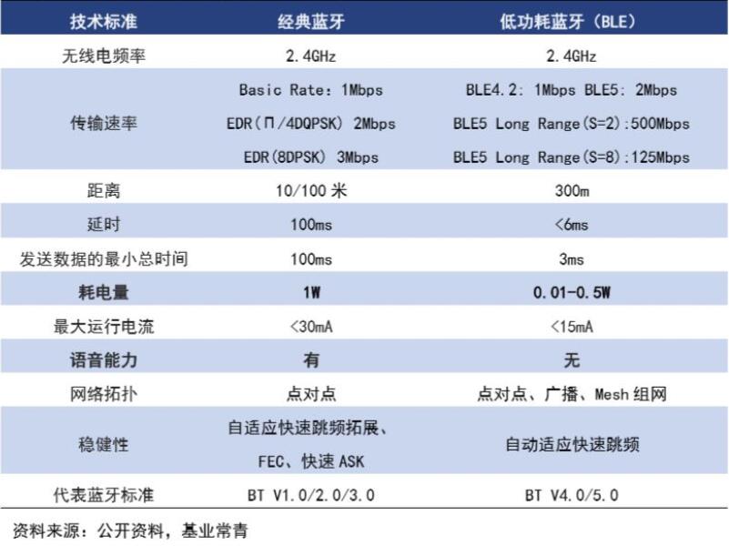 相對于經典藍牙,低功耗藍牙芯片有傳輸遠、功耗低、延遲低等優勢。傳輸距離方面,經典藍牙只有10-100米,而BLE最遠能傳輸300米;連接方式上,經典藍牙只能通過點對點的方式傳輸,而BLE設備能夠能通過點對點、廣播、Mesh組網與其他設備相連;在功耗上兩者的差別巨大,低功耗藍牙運行和待機功耗極低,使用一顆紐扣電池便能連續工作數月甚至數年之久。